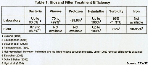 The following Table 1 shows the biosand treatment efficiency in removing pathogens and turbidity.